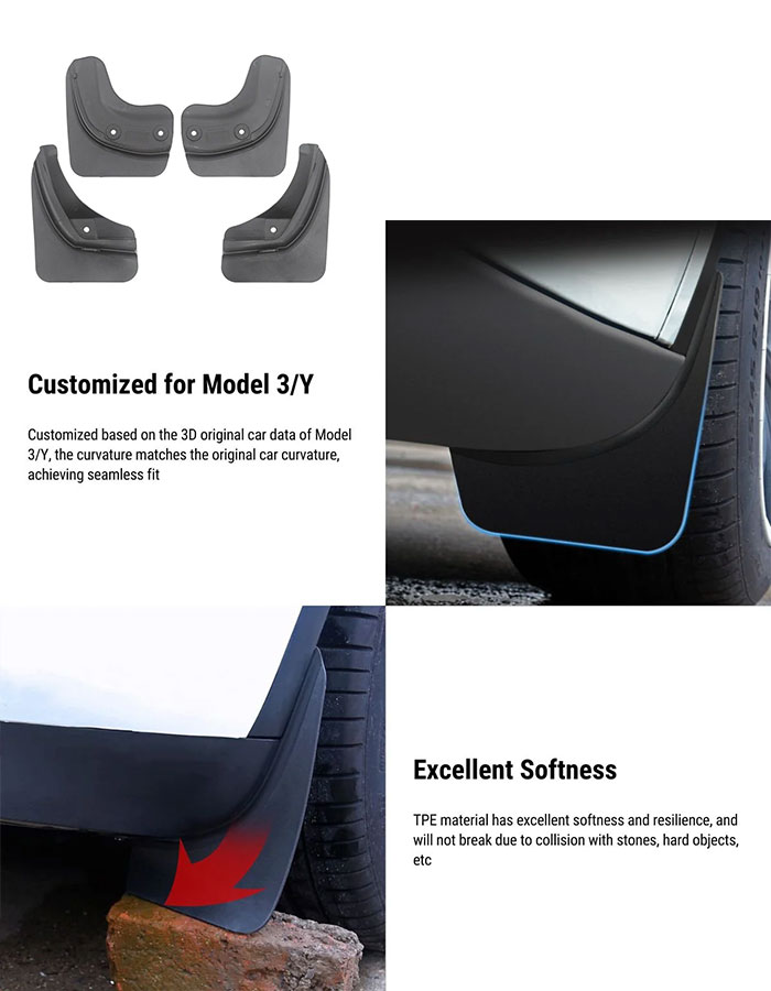 Tesla Model Y / Tesla Model 3 çamurlukları, aracınızın temizliğini ve korunmasını sağlamak için tasarlanmış mükemmel bir aksesuardır. Aşınmaya dayanıklı ve toz ile kir birikimini en aza indirecek şekilde üretilen 4 parçalı dayanıklı kauçuk malzeme, Tesla’nızı temiz tutarken stilinizi de korumanıza yardımcı olur.