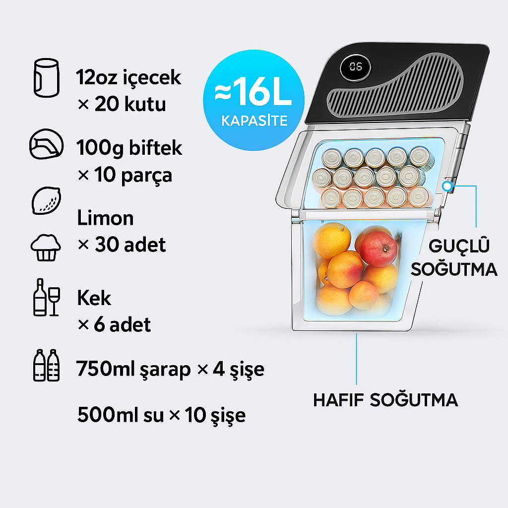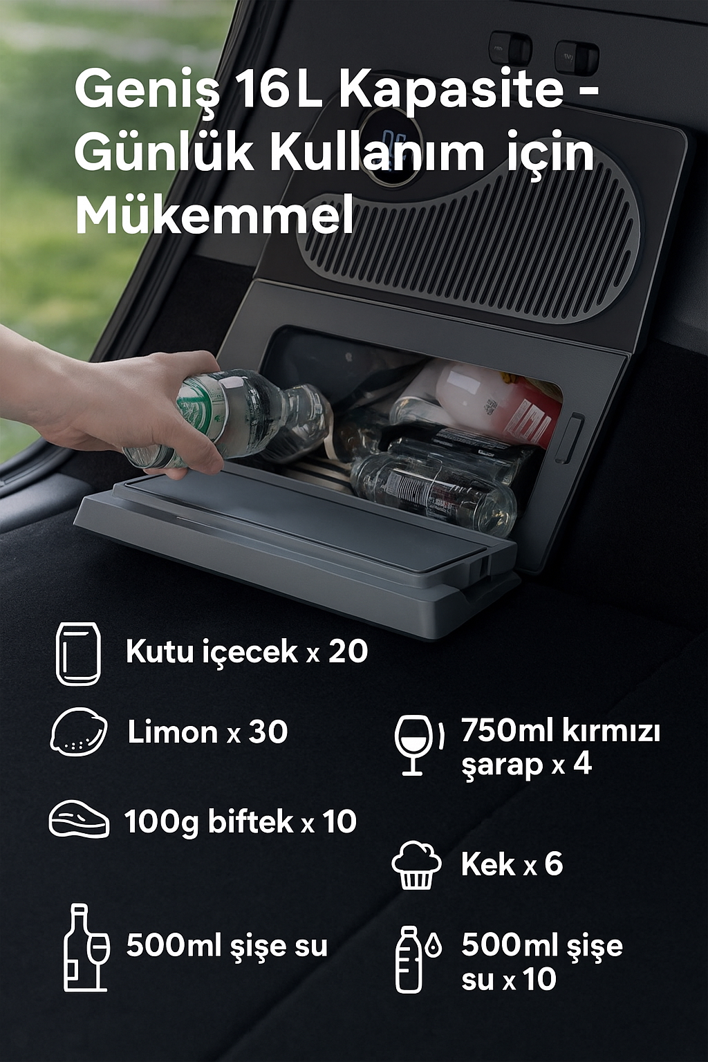 KAPASİTE: 16L depolama alanı, aile gezileri ve uzun yolculuklar için ideal yiyecek ve içecek saklama imkanı sunar